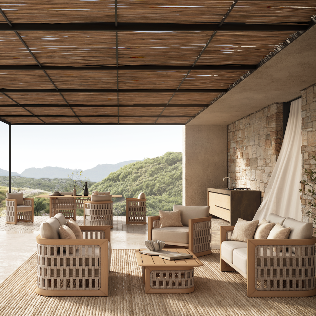 The N2 Three Seater Sofa harmoniously combines traditional elegance with modern approach. Featuring a meticulously crafted teak frame complemented by intricately woven panels, this chair seamlessly blends different materials to create a unique aesthetic. The woven design wraps around the chair in perfect symmetry, adding both texture and transparency to its form.